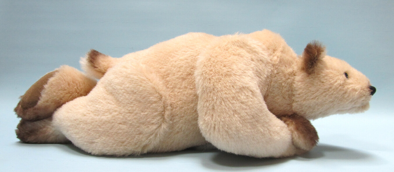 Kiam, the Grizzly Bear is made of tipped Mohair and hand-dyed Alpaca with airbrushed features. He has a double jointed neck, handmade leather nose and hand painted gold glass eyes. Kiam’s claws are handmade of polymer and he has moveable wrist joints and ultrasuede paw pads. He also has wire armatures in his front legs. He is filled with polyfil and stands 11″ tall and 14″ long when posed on all four legs. Kiam is a member of my “Wildlife Series”.
